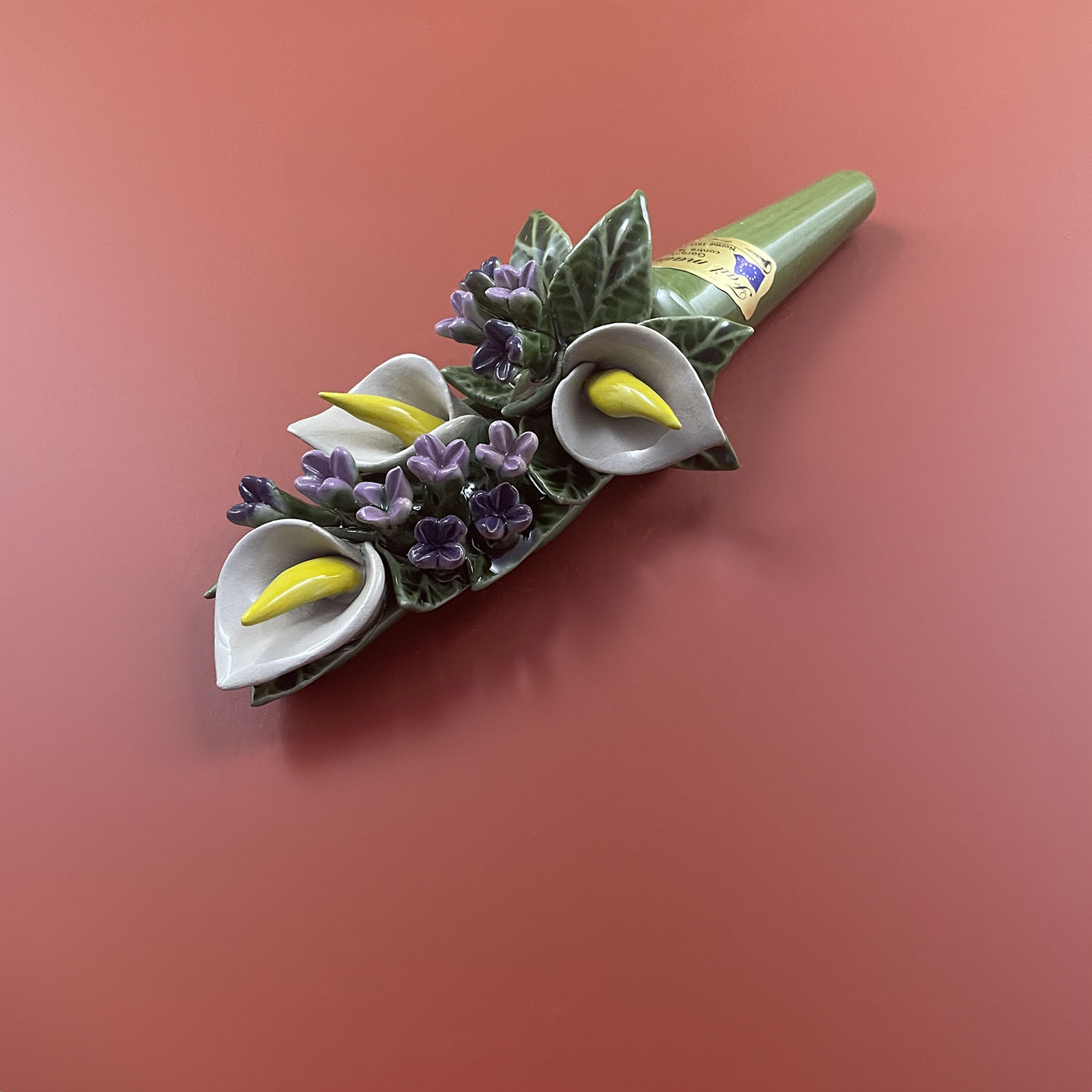 Dit handgemaakte majolica stuk bestaat uit drie aronskelken en vergeet mij nietjes met gedetailleerde bladeren, geplaatst in een slanke groene houder. De combinatie van elegante rozen en glanzende groene bladeren maakt dit tot een stijlvol en duurzaam herdenkingsitem. Ideaal als grafdecoratie, biedt dit majolica kunstwerk een blijvende manier om eer te betuigen aan een dierbare. De stevige, weerbestendige eigenschappen van majolica zorgen ervoor dat dit stuk geschikt is voor langdurig gebruik op een gedenkplaats, waarbij het zijn schoonheid behoudt door de seizoenen heen.